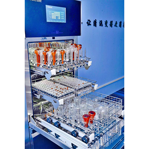 將實驗室器皿裝載到器皿裝載籃架上通過滑軌載入清洗機內(nèi)腔中,通過清洗步驟去除器皿上的污染物(包括有機物、無機物、蛋白質(zhì)等),使器皿上的殘留物被清洗掉;通過漂洗步驟去除器皿上污染物和清洗劑殘留,使器皿上離子殘留量低于檢測下限,通過去除器皿上細胞、病毒、細菌殘留,使活微生物數(shù)量減少到規(guī)定水平;通過干燥步驟去除器皿表面殘留水,使殘留水汽化后蒸發(fā)。